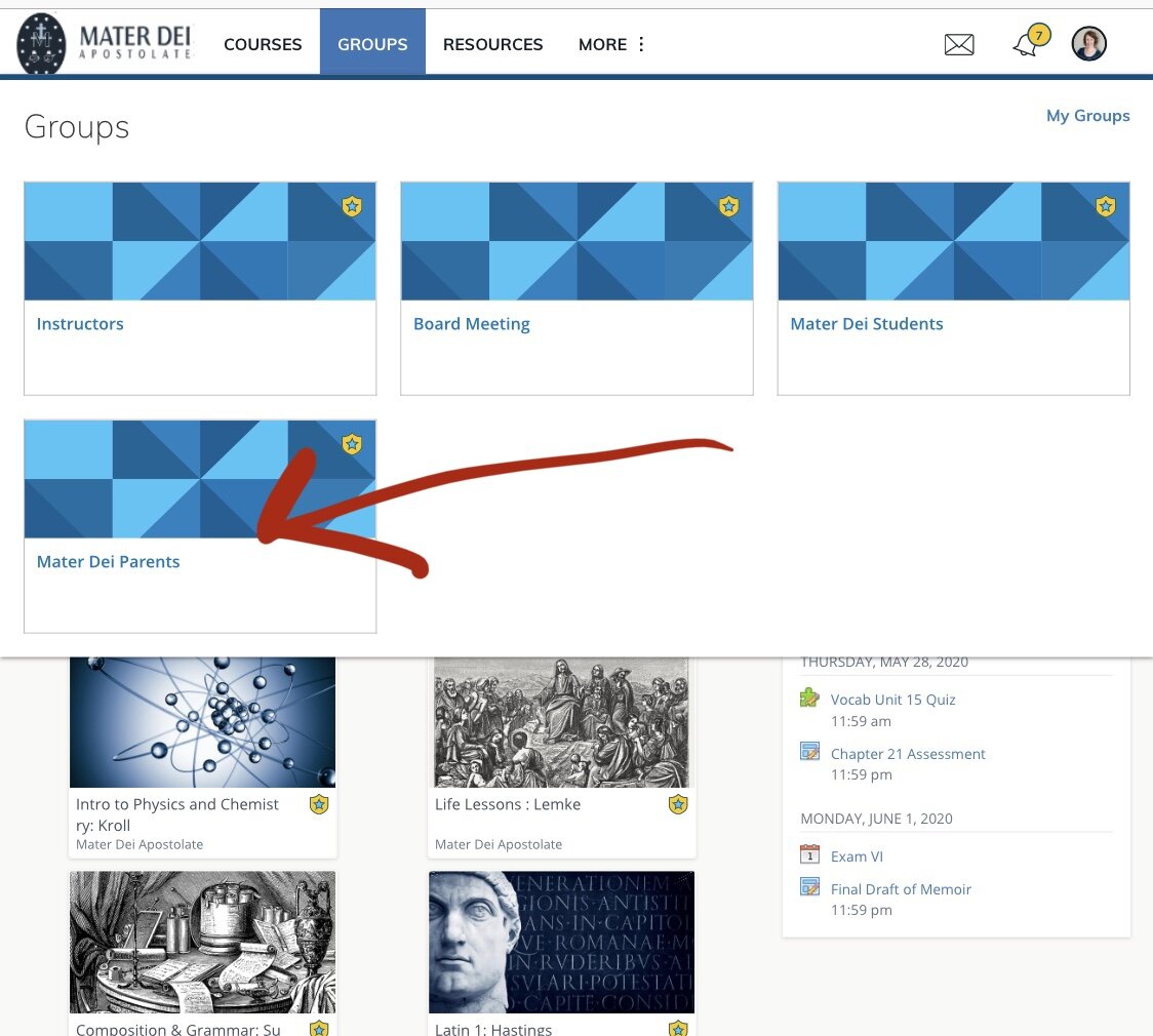 After logging in to your account, click on the course or group that is having the live conference. In this example the live conference will be in the Mater Dei Parents group, so click on “Groups” at the top of the page.